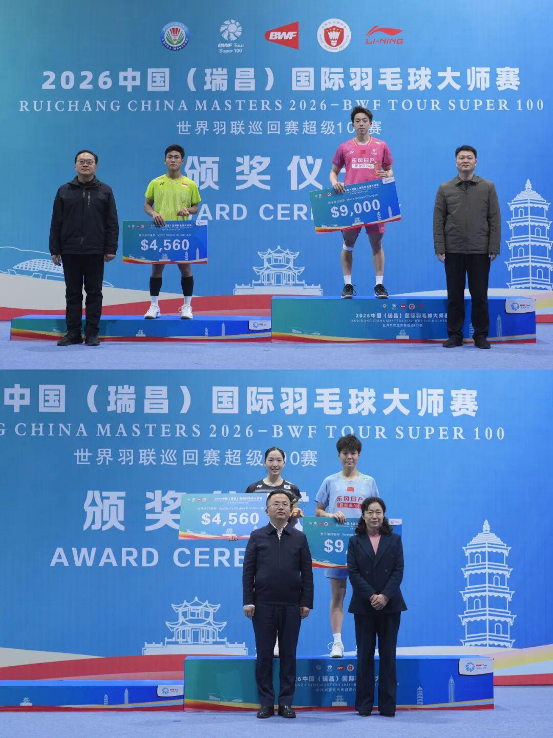 瑞士超级300赛与中国瑞昌超级100赛昨天同日结束争夺,中国羽毛球队在瑞士公开赛斩获女双和混双两个项目的冠军,且都是在决赛中实现会师;在瑞昌大师赛则包揽全部五项冠军。